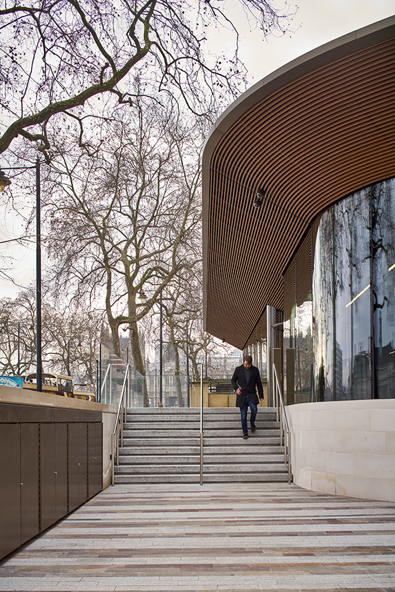 At the entrance, a curved glass pavilion creates a new public face for the MPS with an open, transparent and accessible design that ‘embodies the organisation’s core values’. This pavilion sits within new landscaped civic space as an extension of Whitehall Gardens, and acts as a buffer between public and private realms.