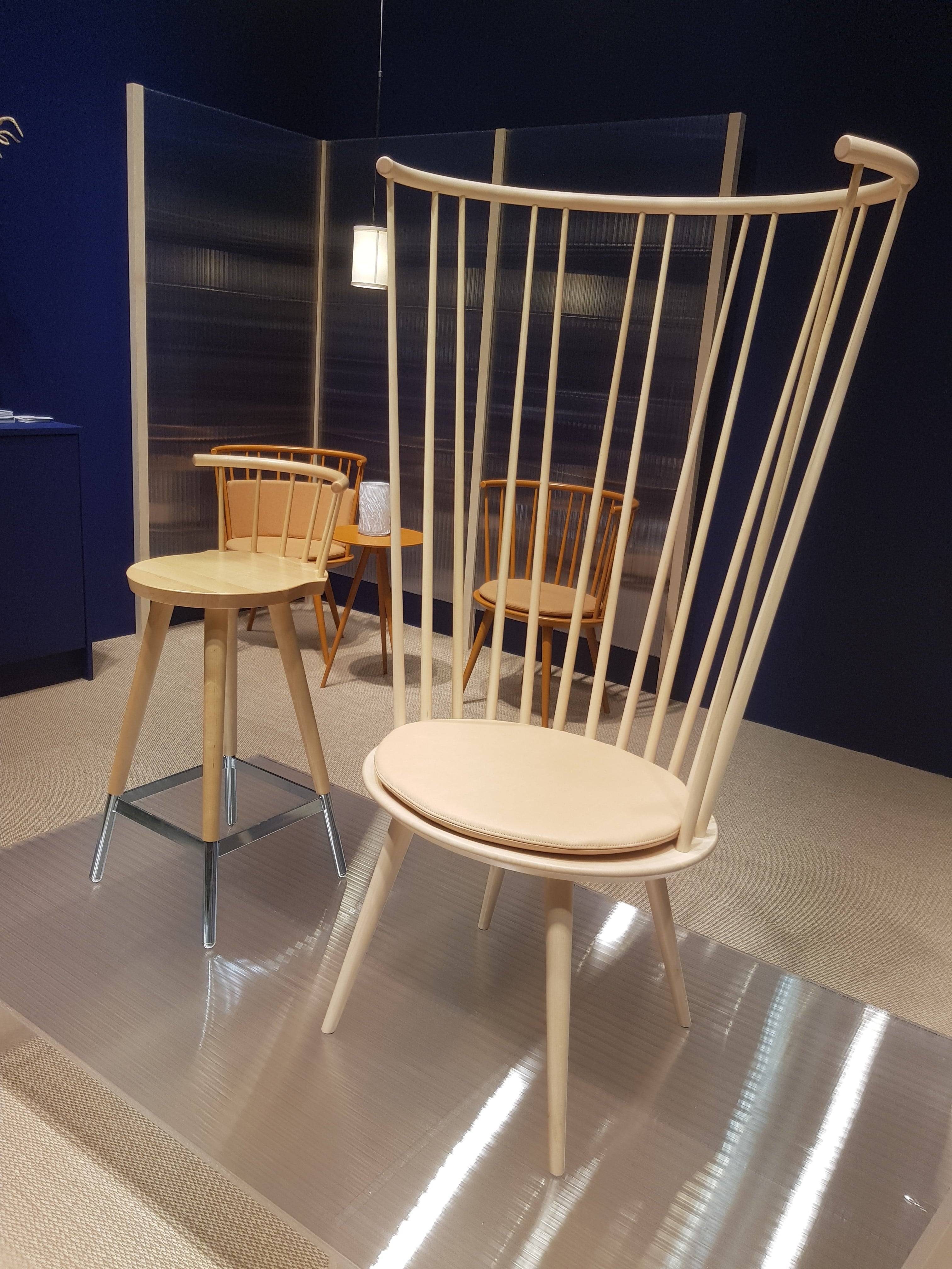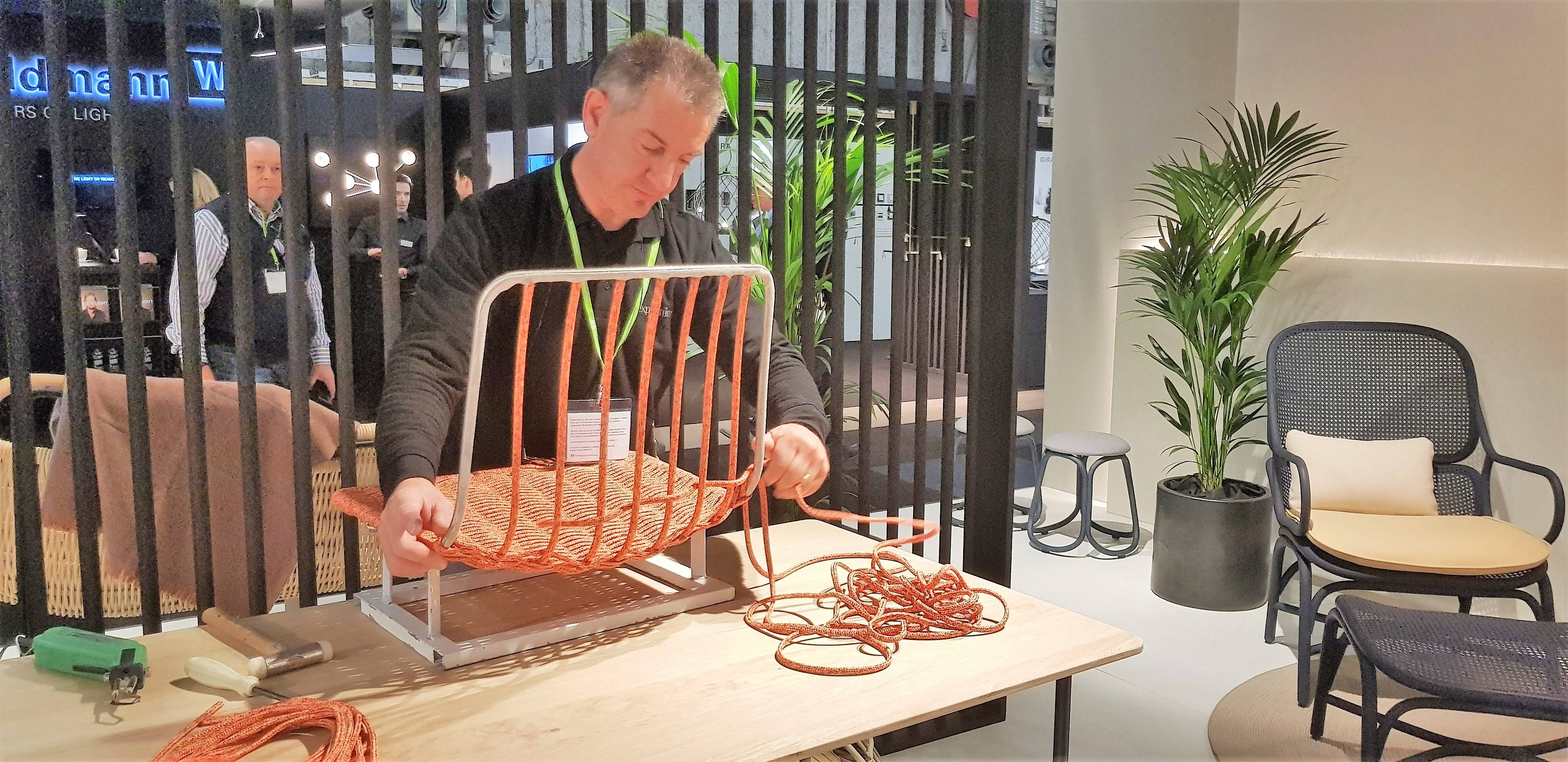 Poiat from Finland used individually spring-loaded turned solid oak rods to create a range of beautiful open storage units – Bastone. Expormin from Valencia had even brought one of their upholsterers to demonstrate their skills.