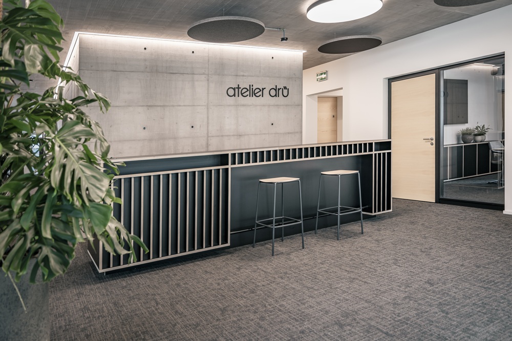 In contemporary office environments, lighting and acoustic solutions increasingly contribute to both functionality and visual identity. At Atelier drü’s new workspace, the interaction between these elements forms a key part of the overall design concept.