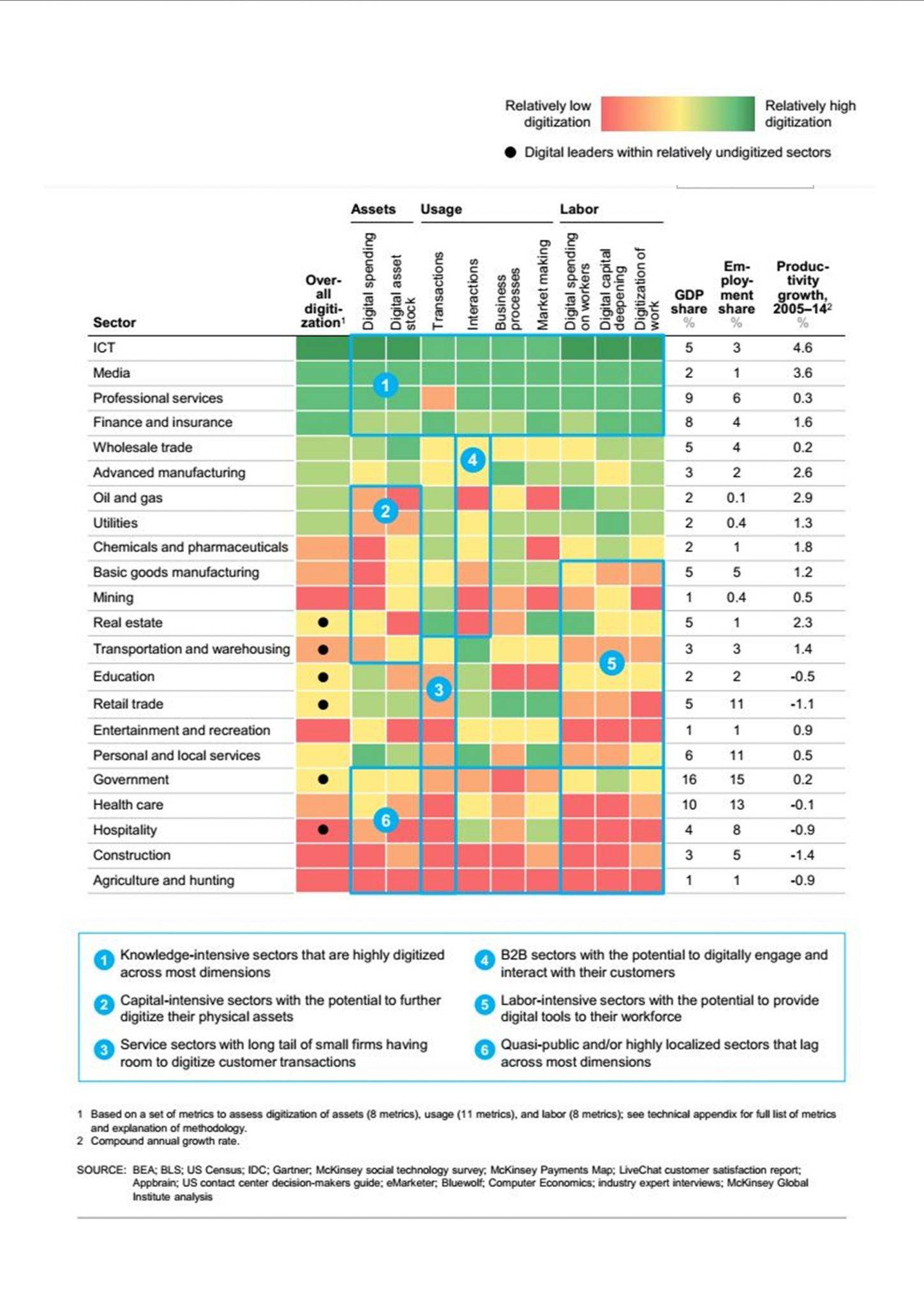Last week we reported on the ways in which the UK government and British firms are falling short in their approaches to the increasingly digital world. It would be wrong to assume that this is solely an issue on this side of the pond however. A recent report from McKinsey highlights how specific sectors and businesses in the US are also sometimes struggling to meet the challenges and embrace the opportunities presented to them by the digitisation of the economy. The report suggests that overall US firms are only realising around 18 percent of their ‘digital potential’ and the major challenge the US faces is no longer bridging the gap between the digital have and have-nots, but the digital haves and have-mores. Intriguingly the report also breaks down this divide by individual sectors, thereby highlighting those parts of the economy that stand to gain most from bridging the digital divide.
