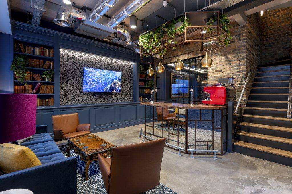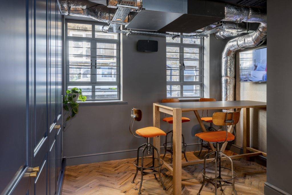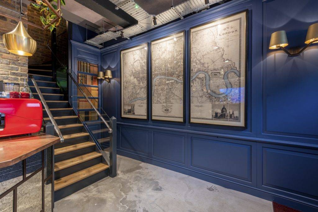 Careful consideration was given to the flow of the space across the different floors with an emphasis on creating a memorable first impression for visitors to the new office. This is epitomised on the ground level where visitors are greeted by a custom-made copper top bar with antique mirrored glass, as well as a striking 3-piece map of London circa 1825 and distinctive joinery made wall panelling.