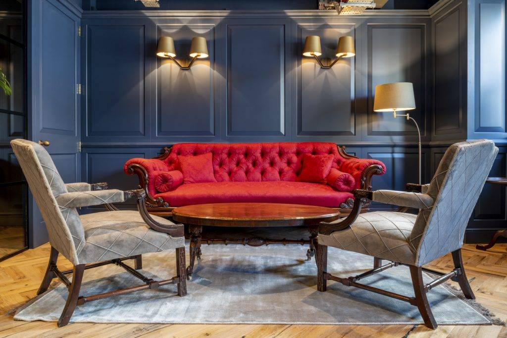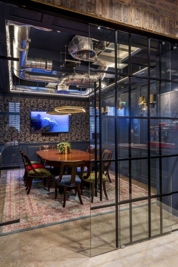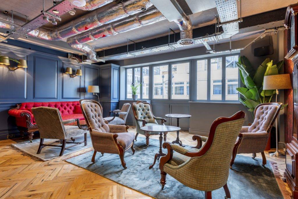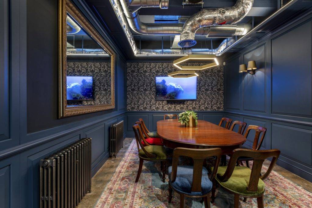 There is also a ‘hidden’ secret doorway, disguised as a bookcase which leads to the toilets and also a large boardroom behind beautiful crittal glazing visible behind the bar. The boardroom is classically decorated and furnished with a reclaimed antique table and chairs while also utilising a beautiful Gustav Damask wall print at the back of the room.
