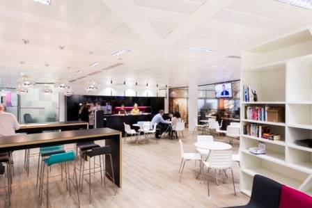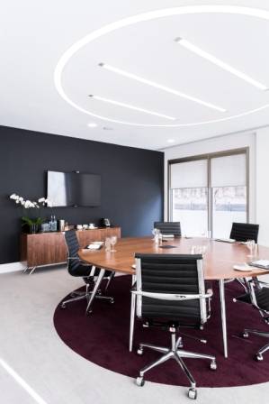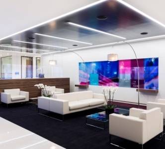 The Interiors Group has completed a project for the design and fit-out of the relocated offices for Instinctif Partners, an international business communications consultancy now situated at 65 Gresham Street, London. The relocation coincided with the launch of Instinctif Partners’ new name (having previously been known as College Group) so the new design became an expression of the new identity. The office fit-out project includes joinery, the installation of a media wall, bespoke feature walls, reception desk and lighting. The flooring consists of porcelain tiles and carpet from Interface. The backlit reception desk displays the client’s twelve corporate colours on rotation. Leather seating was specified for the visitors’ waiting area. The open plan office is designed as a circular newsroom with a high table in the heart of the space highlighted by an oversized dome pendant. The dining area has been fitted out with LED screens and furnished in white.