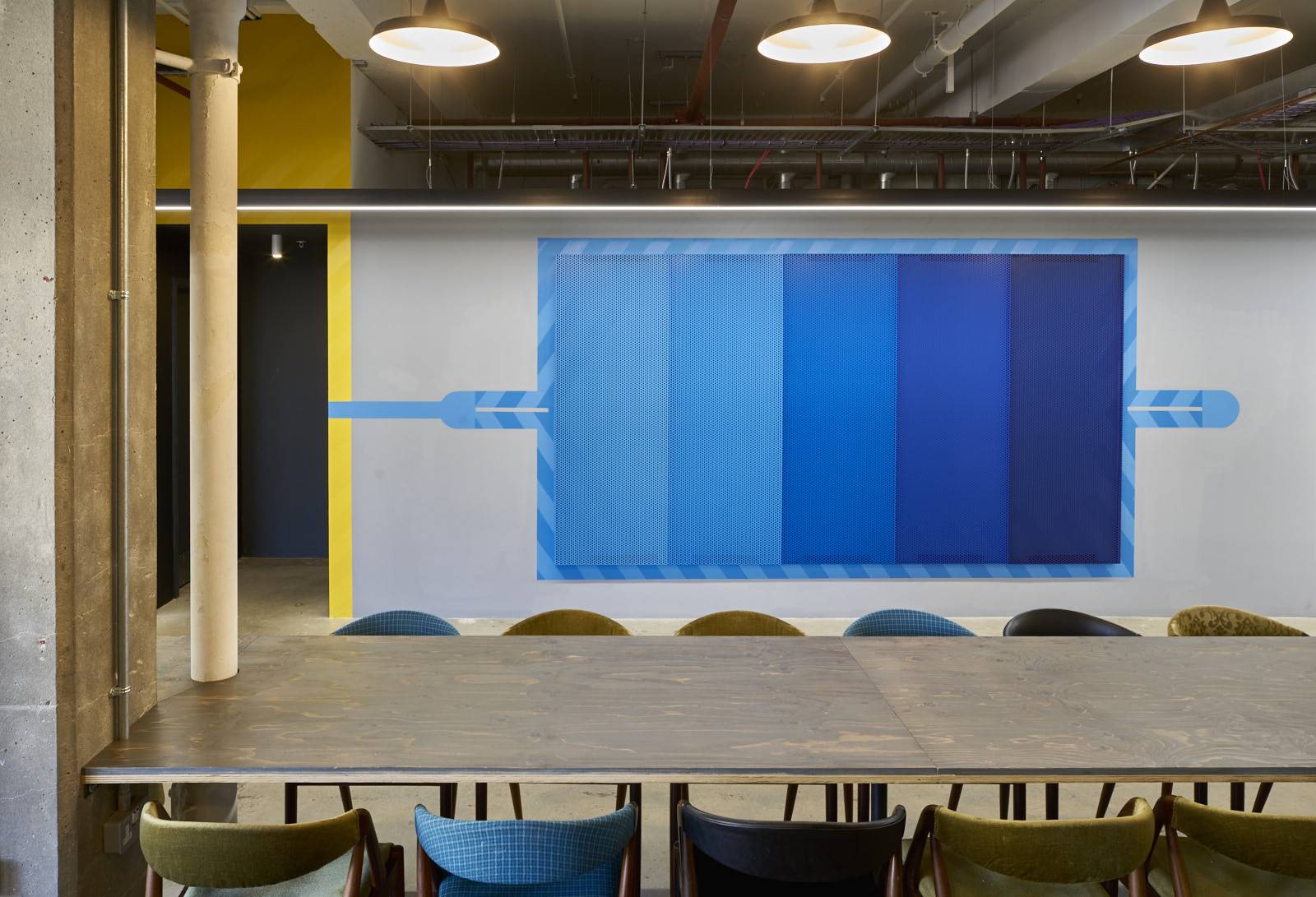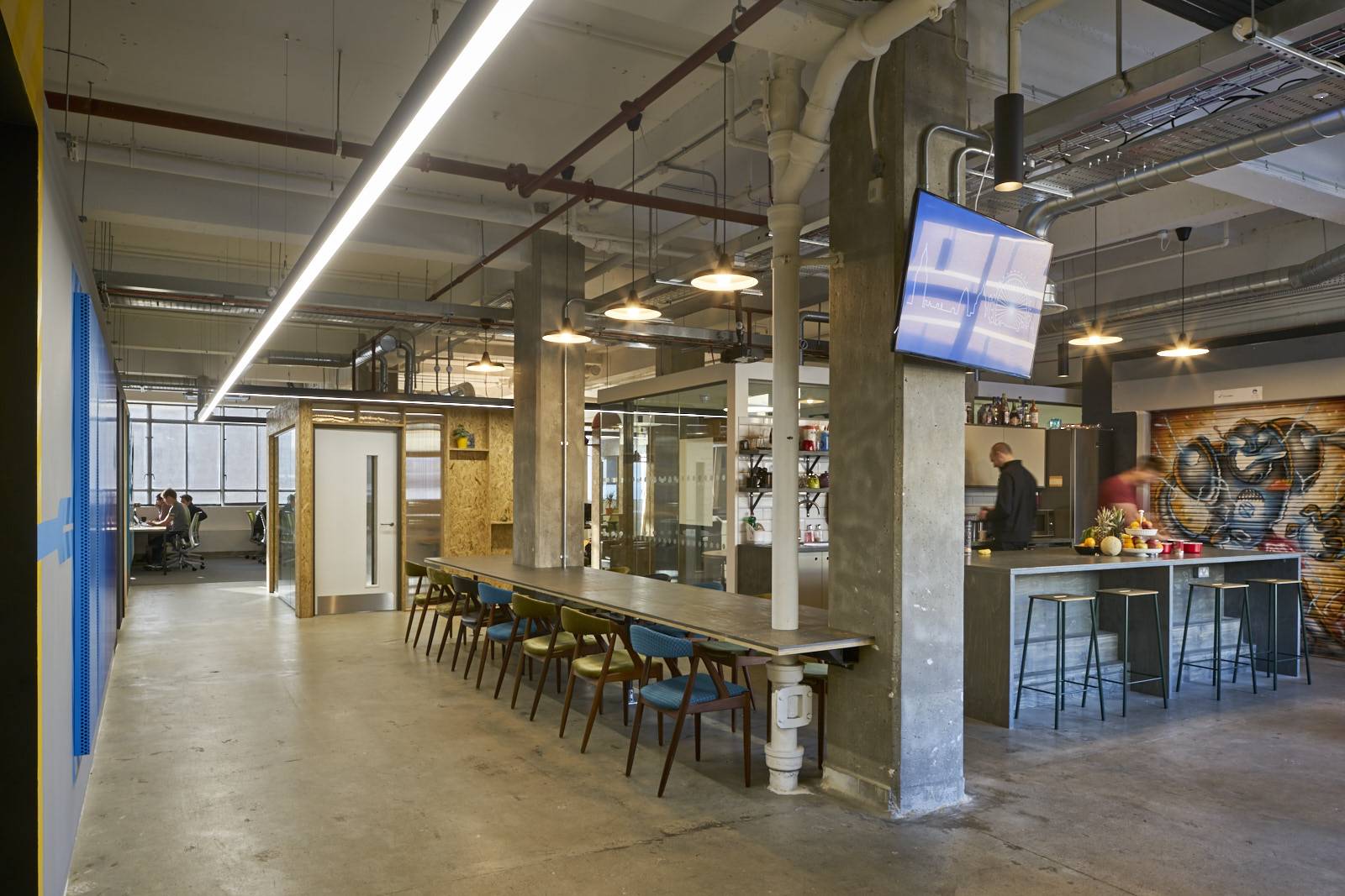 Much of the furniture is bespoke, including the custom-made desks, which have powdercoated metal legs with lacquered-plywood tops, accessible panels and cable management.