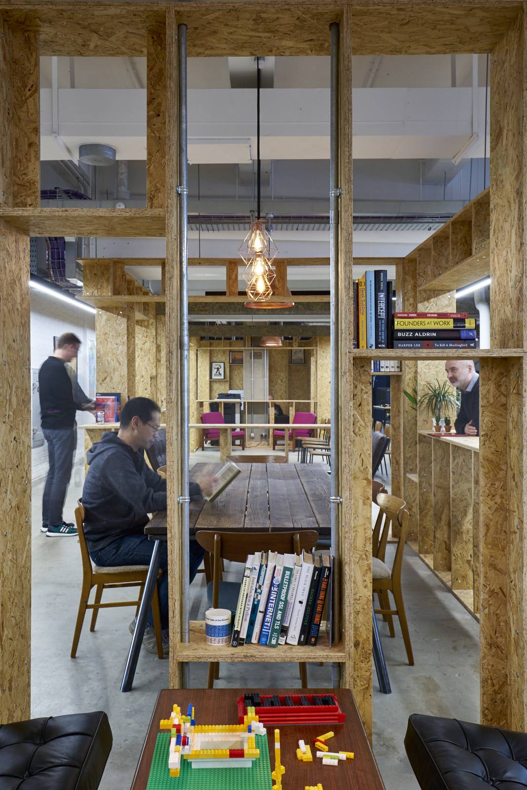 London-based architecture practice Jump Studios has designed the first UK office for tech firm Cloudflare in London. The company, headquartered in San Francisco, is one of the fastest-growing start-ups in the world and is classified as a Unicorn1 company. The new office is a refurbishment of a former paper factory in London’s Southwark area. The refurbished 7,000 square foot office includes around 100 desks with large social areas connected to the outside terrace space. The central area of the office is a form of ‘spine’ constructed from OSB (Oriented-strand board). This spine maintains physical and visual connectivity throughout the floor and forms walls, rooms, storage and shelving units for Cloudflare to display tools, gadgets, books and awards. Informal meeting spaces sit within and around the spine for employees to relax and hold meetings in throughout the day.