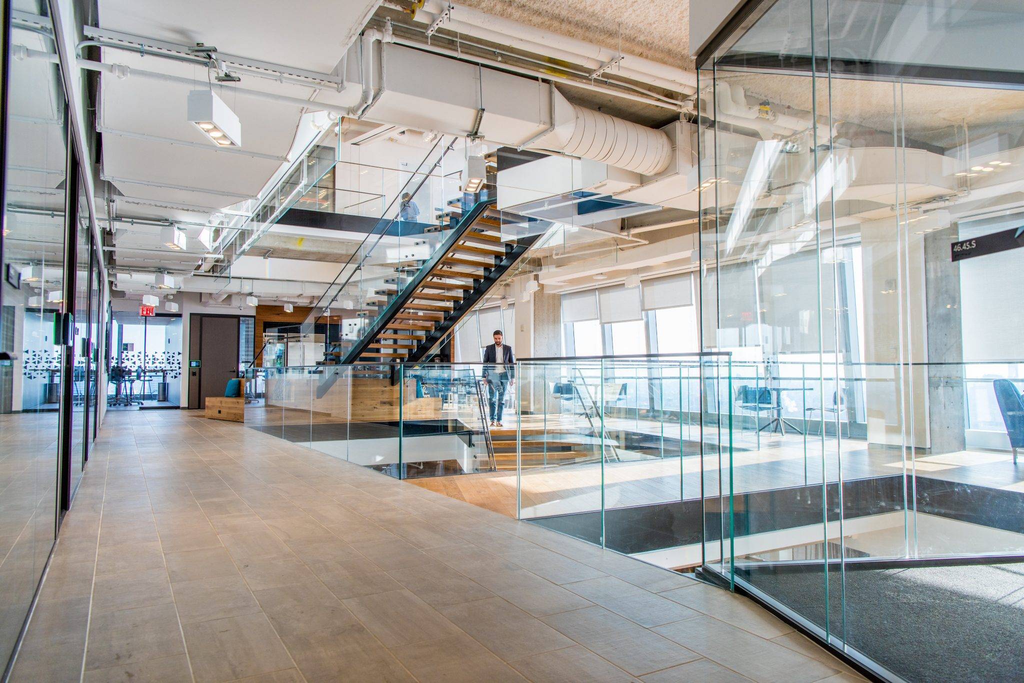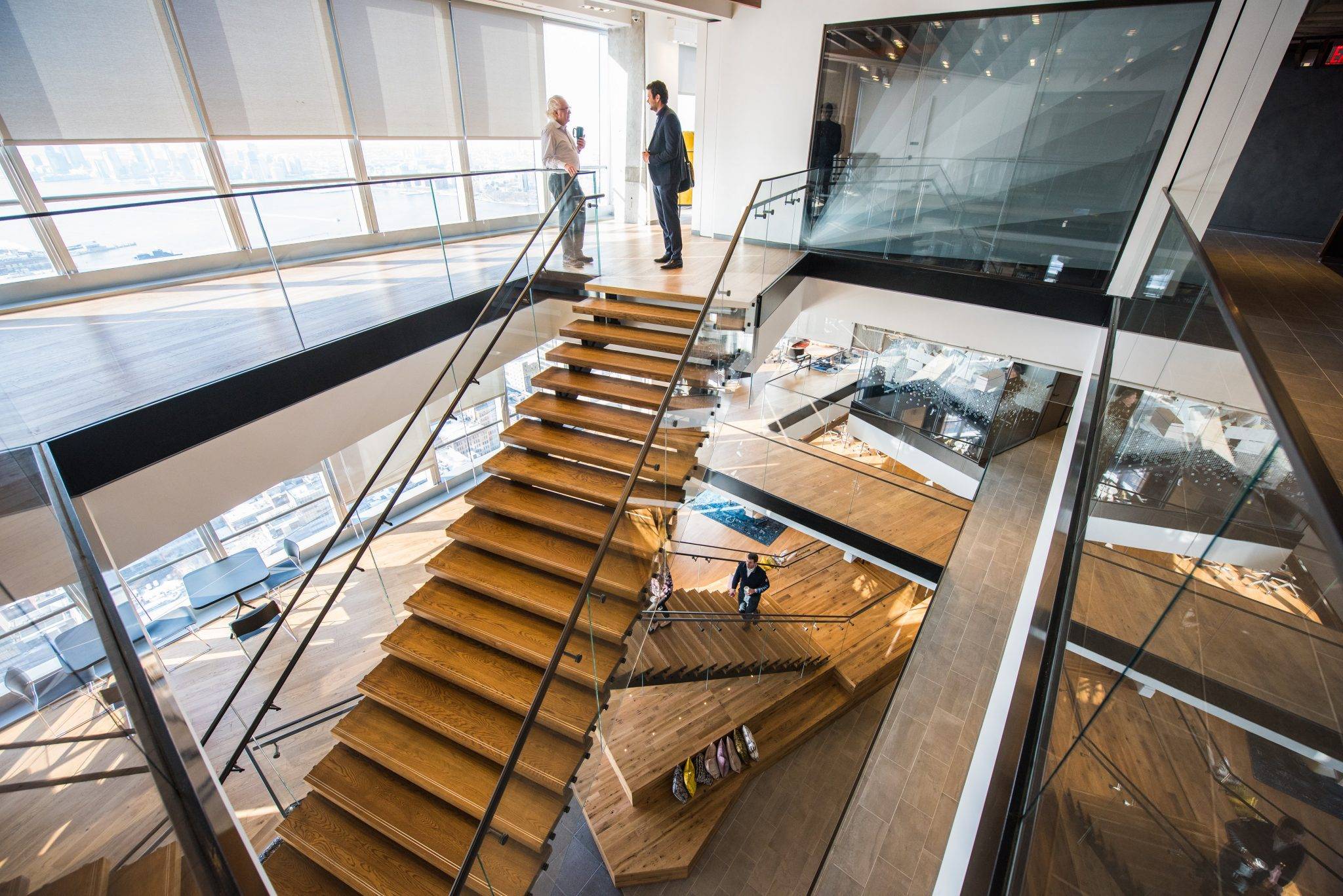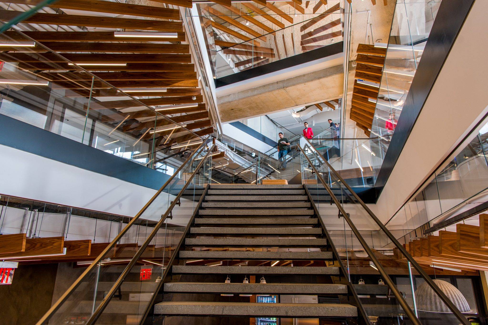 The office promotes health and wellness in multiple ways—with sit-to-stand desks in 75 percent of the open seating, ergonomic furniture, treadmill work stations, and internal stairs connecting every floor—and offers such amenities as concierge services (instead of a traditional reception), lounges and pantries on every floor, wellness/mother’s rooms with refrigerators and sinks, shower/changing rooms, gender-neutral bathrooms, and panoramic views of the city through floor-to-ceiling windows.