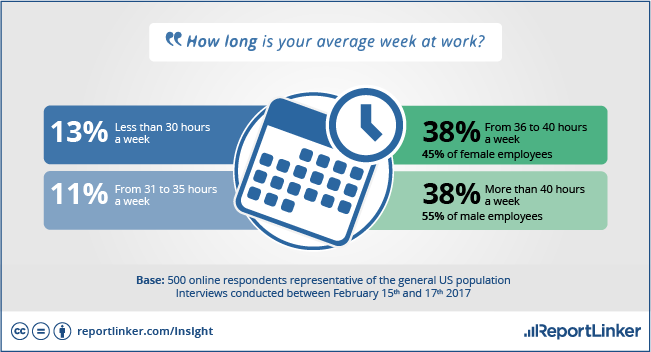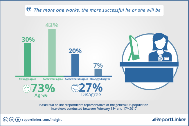 The American work ethic isn’t a myth, according to the study. Three-quarters of Americans agree with the idea that the more they work, the more successful they will be. 76 percent say they work more than 36 hours a week. Men are more likely to put in more hours on the job than women, with 55 percent saying they worked more than 40 hours a week. By contrast, women are more likely to work 36-40 hours per week in order to balance their work and family life.