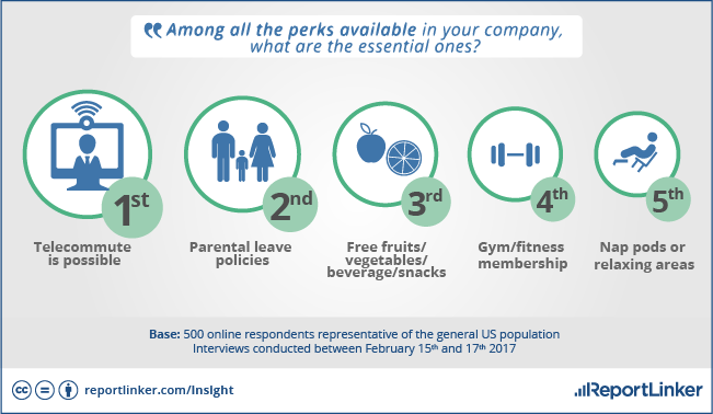 When asked which perks their employers offer, employees most frequently mention healthcare (68 percent of mentions), followed by paid family sick leave or for family deaths (54 percent of all mentions), flexible hours to balance work and personal life (47 percent of all mentions) and career development services (39 percent of all mentions), according to ReportLinker. Both healthcare and paid family leave are offered more frequently to employees who work more than 36 hours a week (76 percent and 61 percent of mentions, respectively).